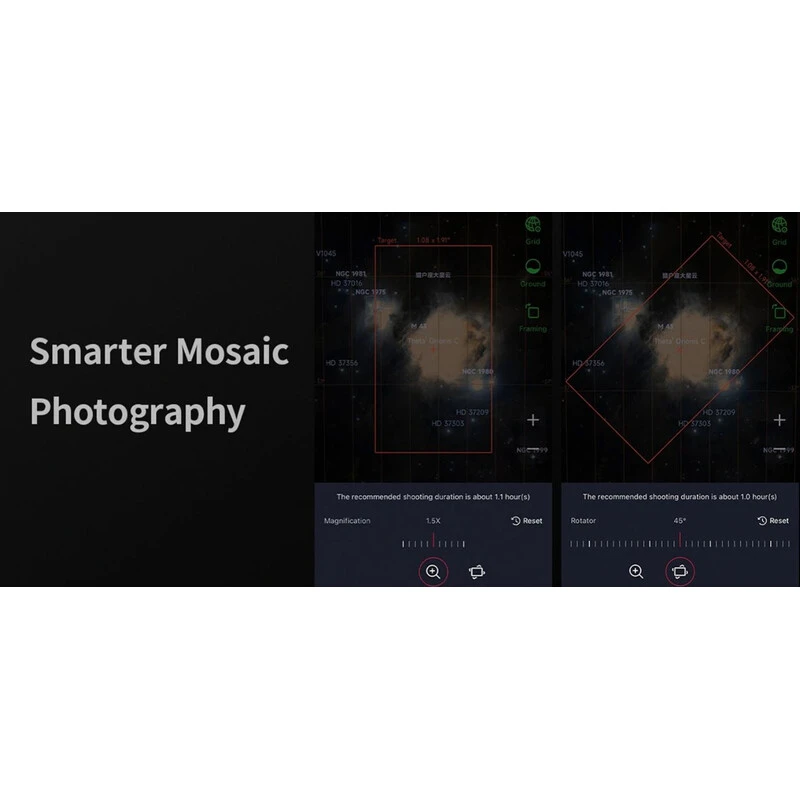 Професионалната апохроматична триплетна оптика осигурява остри като бръснач изображения на нощното небе с отличен контрол на хроматичната аберация. Висококачественото покритие също помага за намаляване на загубата на светлина. Благодарение на високата си чувствителност и ниския шум, смущенията от шум в изображението са сведени до минимум дори по време на продължително заснемане на дълбоко небе, което гарантира отлична производителност дори в най-тъмните нощи. В допълнение, обработката на изображения в приложението предлага автоматично намаляване на шума само с едно натискане на бутон, като същевременно запазва детайлите на небесния обект, създавайки брилянтни изображения дори в силно замърсени от светлина зони! Можете също така да персонализирате стила на вашето изображение по ваш вкус и незабавно да споделите впечатляващите си снимки с други.