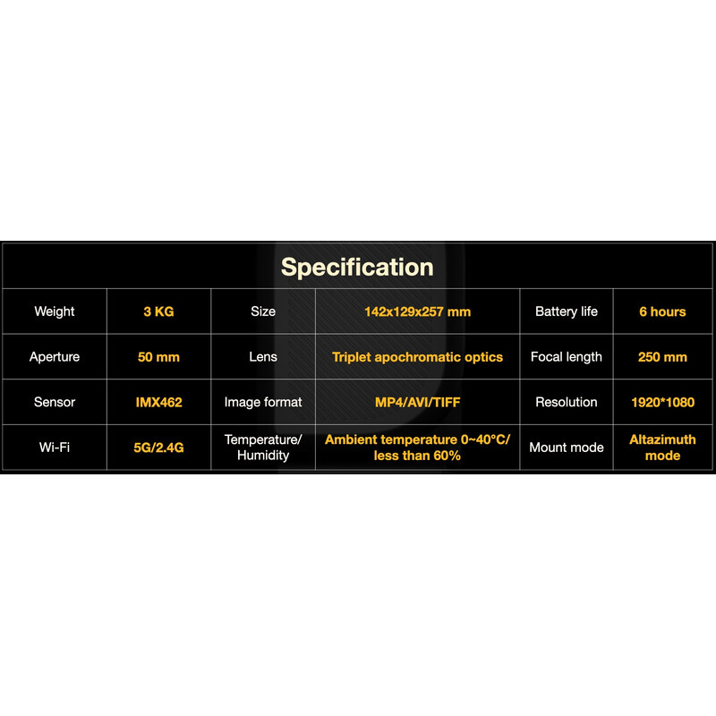 Телескопът е оборудван с 50 мм апохроматична триплетна леща и IMX462 сензор с резолюция 1920×1080 пиксела. Заедно те образуват екип, който създава кристално чист образ и картини с дълбочина на детайлите, която доскоро беше невъзможна.